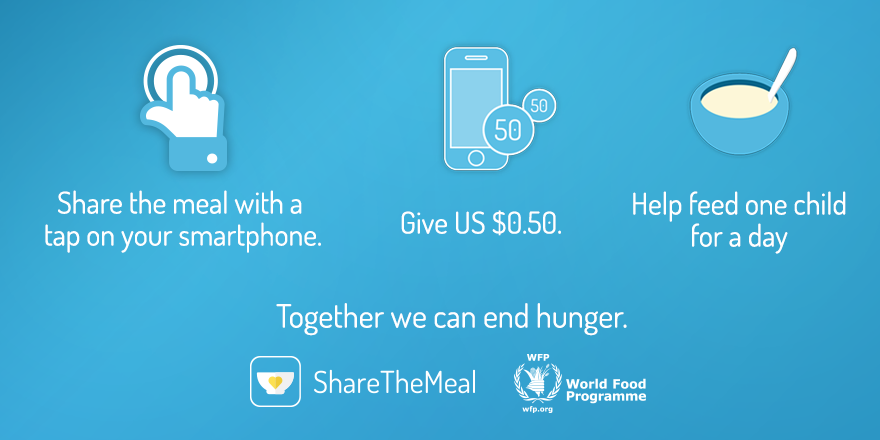 “There are 828 million hungry people in the world. But hunger is entirely solvable. Every day, people around the world are sharing their meal, and the United Nations World Food Programme is on the frontlines ensuring it reaches those most in need. Imagine the collective impact we could have if we all shared the meal.” (Share The Meal, WFP)