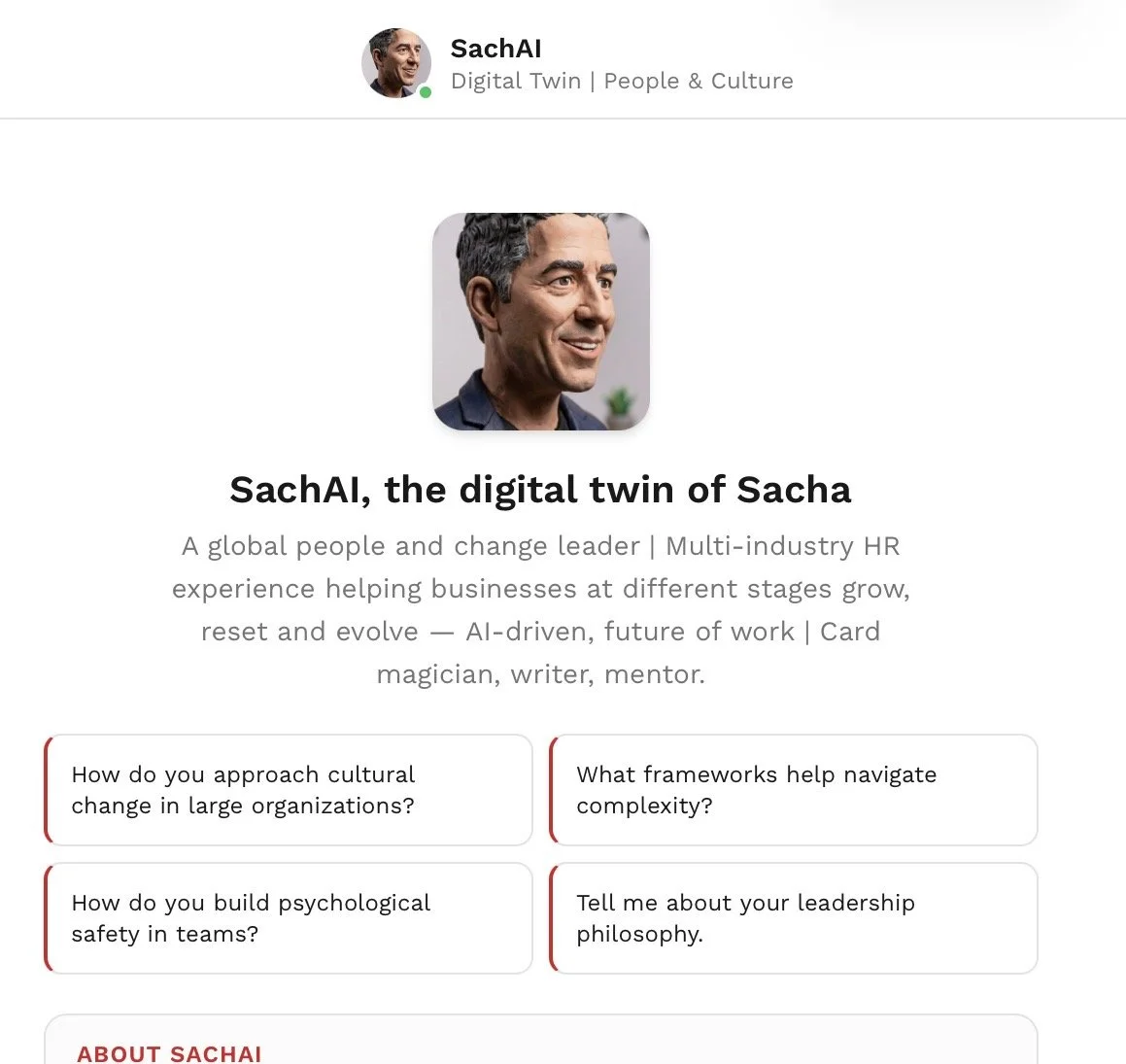 A V2 attempt to design a digital twin. Mostly meant to support and coach on leadership, talent and HR practices at large. Password protected - Reach out to test